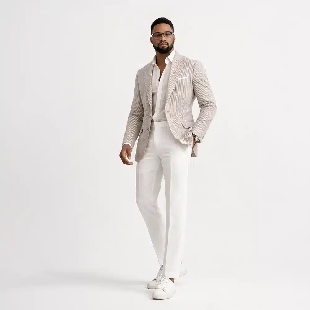 Seersucker is an all-natural cotton fabric designed for the warm temperatures of the spring and summer. This age-old textile is famous around the world for its non-chalant “crinkle” that does not requiring ironing. Our seersucker sport coat is handmade including the functional cuffs, deep pleated patch pockets, and shirt style shoulders.